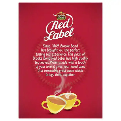 Description Brooke Bond Red Label Strong Blend Tea is one of India’s largest selling packaged tea brands. Brooke Bond Red Label Strong Blend Tea is a blend tea with best quality leaves; processed in the unique Brooke Bond Tea Excellence Centre. Since 1869, Brooke Bond has brought you the perfect tasting tea experience with the best-chosen leaves. It was in 1903 that Brooke Bond launched Red Label. That is when Brooke Bond Red Label started worked to create India’s one of most favourite beverage chai. Every cup of Red Label is brewed with the best-chosen tea leaves; that ensure your tea has strength, rich colour, and refreshing taste. We believe our tea has the taste of togetherness that gives that perfect taste, colour, and irresistible aroma. Red Label is all about coming together over a warm cup of tea with everyone arounds. It is the Swad Apnepan ka (Taste of Togetherness). Brooke Bond Red Label stands for inclusiveness and making world a better place one cup at a time. Enjoy the great tasting range from Brooke Bond Red Label Strong Blend Tea.