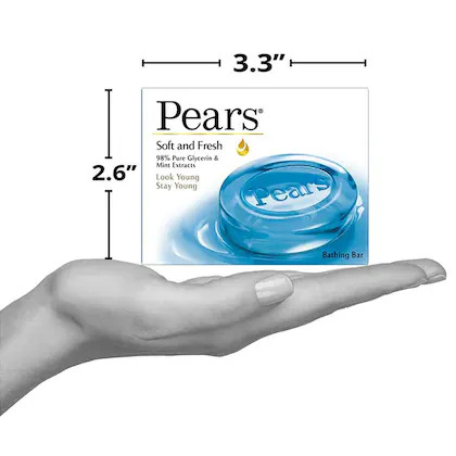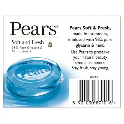 Description Pears Soft & Fresh Soap is enriched with mint extracts and pure glycerin. These Mint extracts keep your skin looking soft and fresh in the summer, while 98% pure glycerin gently cleanses your skin. So what are you waiting for? Buy the product at the best rate, right here! Disclaimer: Despite our attempts to provide you with the most accurate information possible, the actual packaging, ingredients and colour of the product may sometimes vary. Please read the label, directions and warnings carefully before use.