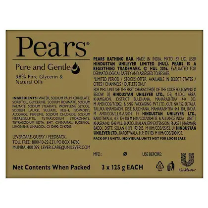 Description There's nothing like knowing that your skin is soft, smooth and glowing. With the right products you can have that feeling every single day, starting with your cleansing routine. Pears understands this and brings to you its heritage product - the glycerine soap, Pears Pure & Gentle Bathing Bar. With 100% more glycerine vs grade 1 soap, Pears Pure & Gentle mild bathing bar, cleanses your skin for visibly glowing, brighter skin, every time you shower. This bathing bar soap with glycerine helps preserve the moisture of your skin and keeps it soft and glowing. Pears' gentle formula has 0% Parabens and is mild on skin. Pears Bathing Bar Soap also helps wash away germs. Just rub it between your hands and massage rich creamy lather over your face and body before rinsing away thoroughly. For best results, use twice a day, morning and evening. Pears Pure & Gentle Bathing Bar is packed in 100% recyclable cartons, our initiative towards being environmental friendly. Explore the entire range of Pears Pure & Gentle Body Wash & Liquid Hand Wash that are 100% soap Free, pH balanced and dermatologically tested. Add the Pears Range to your beauty regime to see for yourself. Disclaimer: Despite our attempts to provide you with the most accurate information possible, the actual packaging, ingredients and colour of the product may sometimes vary. Please read the label, directions and warnings carefully before use.
