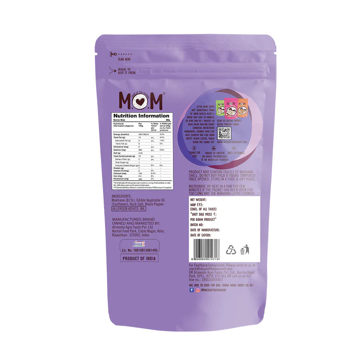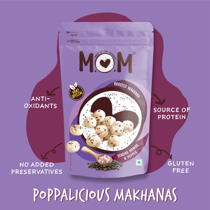 Description: MOM's Sendha Namak N Pepper Makhanas are packed with crunch, making them perfect for Vrat. From classic Salt and Pepper to bold Cheddar Cheese and Smoky BBQ, our flavored makhanas are ready to enjoy anytime. Grab a pack for a crunchy, guilt-free treat and start snacking the healthy way! Packed with essential vitamins and minerals, makhanas are a light and nutritious snack made from lotus seeds. A popular alternative to fried snacks, they’re seasoned with a variety of spices like chili, garlic, lemon, and pepper. Low in fat and calories but high in protein and fiber, MOM's Makhanas are perfect for any gathering. Serve them up and let the good times roll!