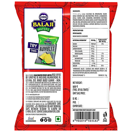 About the Product Give in to the sweet notes of tomato. Balaji is one of India’s leading snack food manufacturers and distributors. Enjoy the taste of tomato on potato chips. Have a delightful experience with your friends and family. Ingredients Edible Vegetable Oil (Palmolein), Sugar, Iodised Salt, Maltodextrin, Spices & Condiments (Chilli Powder, Cumin Powder, Clove Powder, Cinnamon), Dehydrated Vegetable Powder, Tomato, Onion, Garlic Acidity Regulator, Flavour Enhander, Anticaking Agent