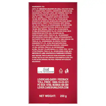 Description Red Label Leaf Tea is your best bet to start your mornings peacefully. Even during work hours or at night, a cup of this tea is just the kick your brain needs. It is made from the finest quality of tea leaves and has a strong aroma to make a perfect cup of tea. So go ahead, buy this product online today! Disclaimer: Despite our attempts to provide you with the most accurate information possible, the actual packaging, ingredients and colour of the product may sometimes vary. Please read the label, directions and warnings carefully before use.