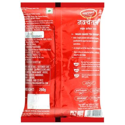 Description Wagh Bakri Navchetan Strong leaf Tea is your best bet to start your mornings peacefully. Even during work hours or at night, a cup of this tea is just the kick your brain needs. It is made from the finest quality of tea leaves and has a strong aroma to make a perfect cup of tea. So go ahead, and buy this product online today! Disclaimer: Despite our attempts to provide you with the most accurate information possible, the actual packaging, ingredients and colour of the product may sometimes vary. Please read the label, directions and warnings carefully before use